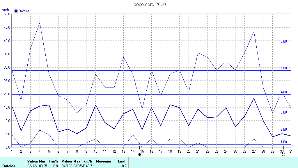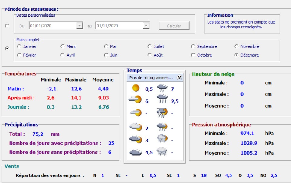 Décembre 2020: résumé des relevés automatiques Retrouvez aussi ici le résumé mensuel de la station météo-France d'Abbeville située à 10 km de chez moi en direction de l'ouest sur un plateau ainsi que le résumé climatologique d'infoclimat de cette station Bulletin climatique de la Picardie pour ce mois, édité par Météo-France Graphiques du mois en bas de page Résumé des relevés Mois une nouvelle fois très doux sauf au tout début et en fin de mois où on a retrouvé des valeurs normales sans froid réel La Tnm est de 4,49°C pour une normale de 2,46°C soit +2°C La Txm est de 9,03°C pour une normale de 7,71°C soit +1,3°C La Tm est de 6,76°C pour une normale de 5,08°C, un bon excédent thermique donc avec +1,7°C Record mensuel de Tnx, la minimale la plus élevée avec 12,6°C (précédent record de 11,6°C) 2 jours de gel seulement (contre 10 en moyenne). Il est à noter que depuis quelques années, le nombre de jours de gel semble en chute libre mais je sortirai les statistiques précises. L'ensoleillement est très faible avec 25 h de soleil (-50%) mais j'ai un doute sur ce chiffre, bien loin de mes relevés photovoltaïques qui sont à peu près dans les normales, en léger excédent. Pas mal de précipitations avec 75,2 mm à ma station, proche des normales de saison. La Somme au fond du jardin a d'ailleurs vu son niveau bien augmenter lors de la dernière décade. (environ 30 cm de plus)