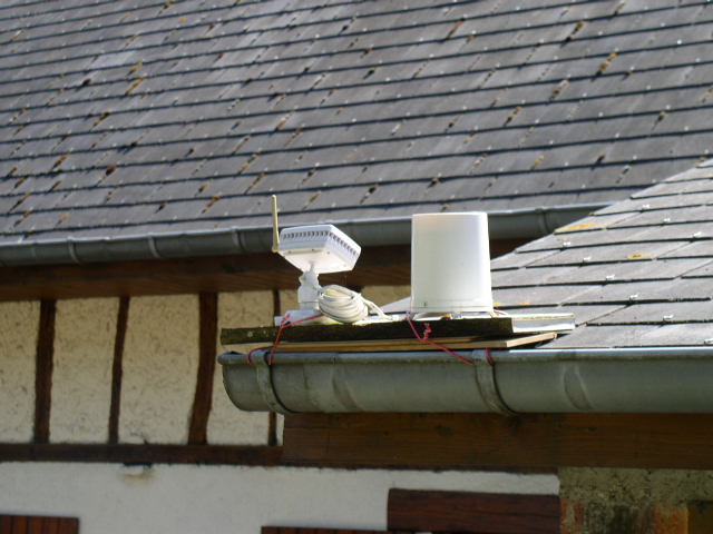 C'est un modèle à auget. Chaque basculement d'auget comptabilise 1 mm de pluie soit 1 L d'eau par m2 pluviomètre et son capteur solaire pluviomètre et son capteur solaire En juillet 2007, innovation technologique sur le pluviomètre dont la précision passe de 1 mm à 0,2 mm. Pour cela, j'ai multiplié la surface de captage par 5. J'ai récupéré un abat-jour en plastique que j'ai adapté et siliconé sur le pluviomètre. Sa surface étant multipliée par 5, je capte 5 fois plus de pluie. Les basculements d'auget se font donc 5 fois plus vite. Un basculement ne correspond plus à 1 mm mais 5 fois moins soit 0,2 mm. Il me suffit ensuite de bien lire ma console, chaque mm affiché ne compte désormais que pour 0,2mm! Par ex ce 3/07/2007 au matin, je relève 8 mm sur la console soit 1,6 mm en réalité tombés pour la nuit. Ce facteur de correction est apporté dans les mesures effectuées par le logiciel wswin32 Le pluviomètre en août 2009 vu de près Le pluviomètre en août 2009 vu de loin Photo du nouveau pluviomètre rénové l'anémomètre et girouette qui est sur le toit. Un mât d'antenne fixé solidement à la cheminée permet une hauteur d'environ 9 m et une mesure sans basculement. l'anémomètre en août 2009 vu de loin l'anémomètre en août 2009 vu de près l'anémomètre en août 2009 vu de très prés Mât de l'anémomètre à environ 10 m de hauteur Vue grossie de l'anémomètre girouette