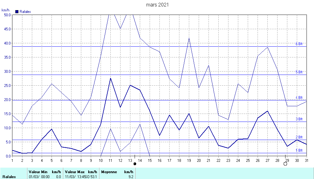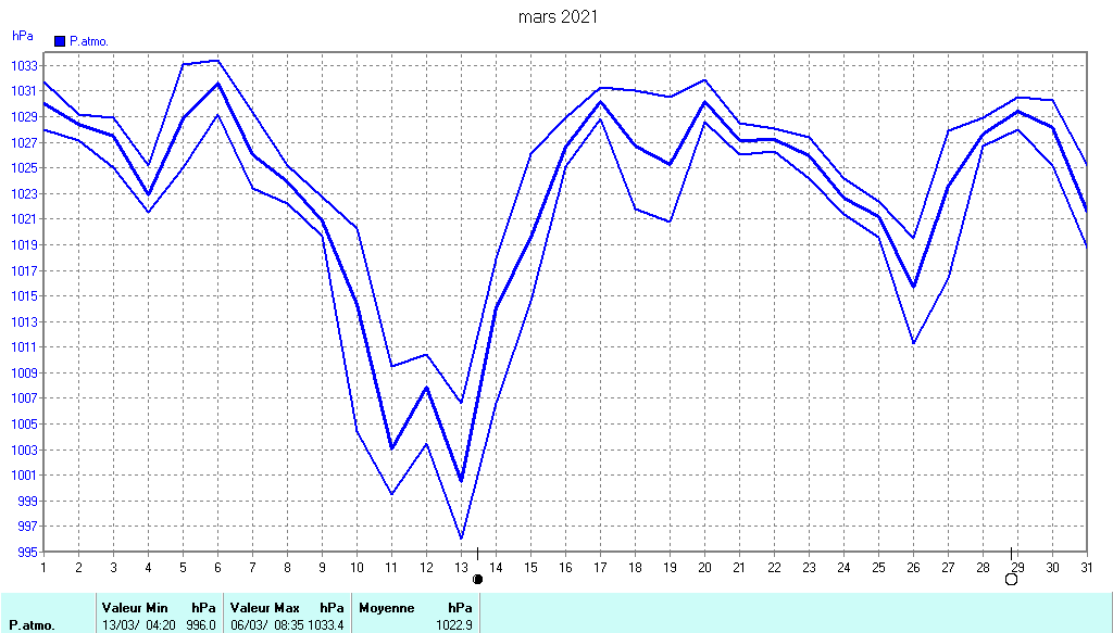 Mars 2021: résumé des relevés automatiques Retrouvez aussi le résumé mensuel de la station météo-France d'Abbeville située à 10 km de chez moi en direction de l'ouest sur un plateau ainsi que le résumé climatologique d'infoclimat de cette station Graphiques du mois en bas de page Résumé des relevés Mois dans les normales en grande frais voir froid puis très doux et printanier les derniers jours La Tm est de 7,72°C pour une normale de 7,58°C mais tout le mois s'est déroulé sous les normales La Tnm est de 2,84°C pour une normale de 3,3°C avec 7 jours de gel dans les normales La Txm est de 12,6°C pour une normale de 11,86°C A noter 4 jours avec plus de 20°C mais 1 jour de chaleur avec plus de 25°C une première et donc un record pour un mois de Mars. Peu de pluie avec 38,6 mm (normale de 60 mm Très bon ensoleillement mais la station Météo-France ne fournit plus de mesures