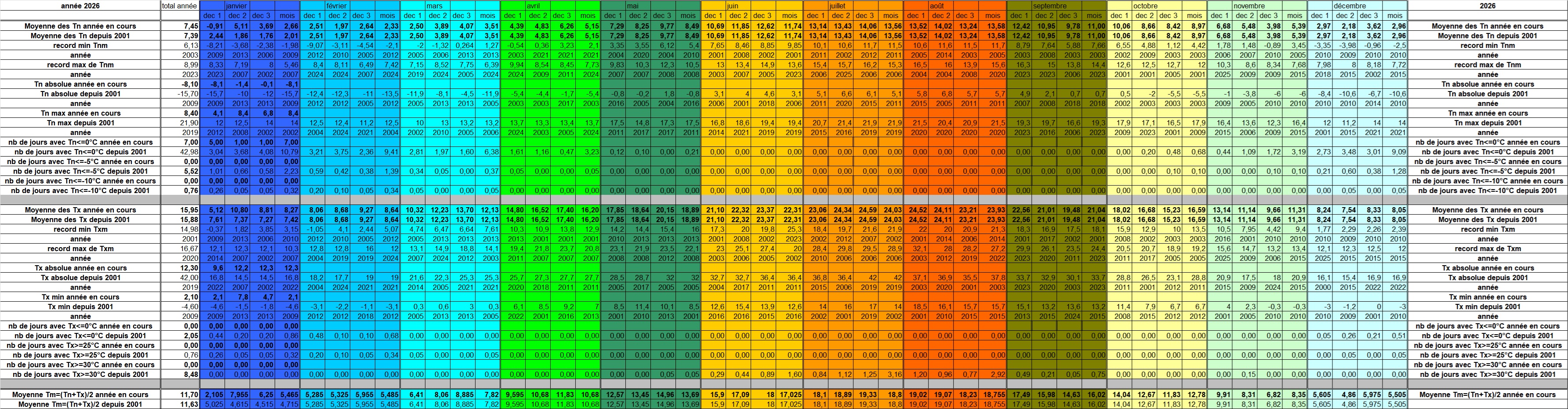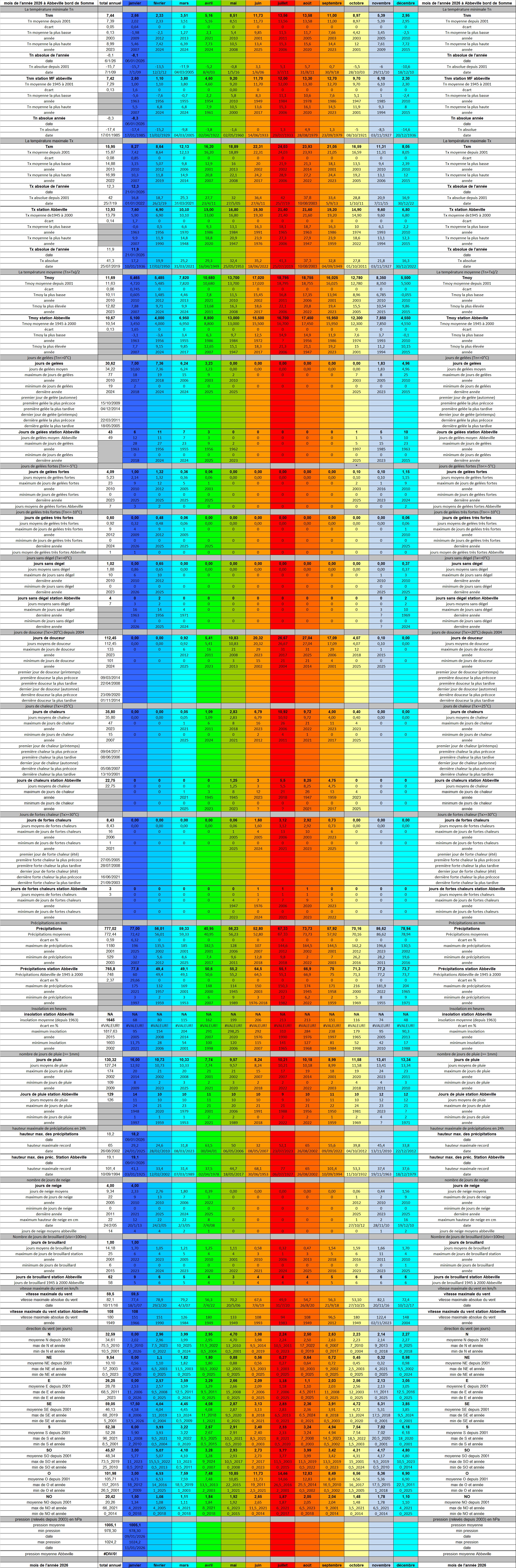 | archives de l'année 2026 Bilan climatique de l'année 2026 Résumé quotidien des relevés automatiques Tous les graphiques en bas de page Bilan climatique de 2026 Nouvelles statistiques sur les premiers et derniers jours de gelées, chaleur, vents dominants et pression moyenne Moyennes pour Saint Riquier puis Abbeville à partir de 2020 calculées sur la période 2001-2024: Moyennes pour Abbeville calculées sur la période 1945-2001 sauf précipitations 1971-2001 Température en °C Précipitations en mm ou L/m2 insolation en heures Voici aussi le tableau des températures par décade relevés mois par mois
