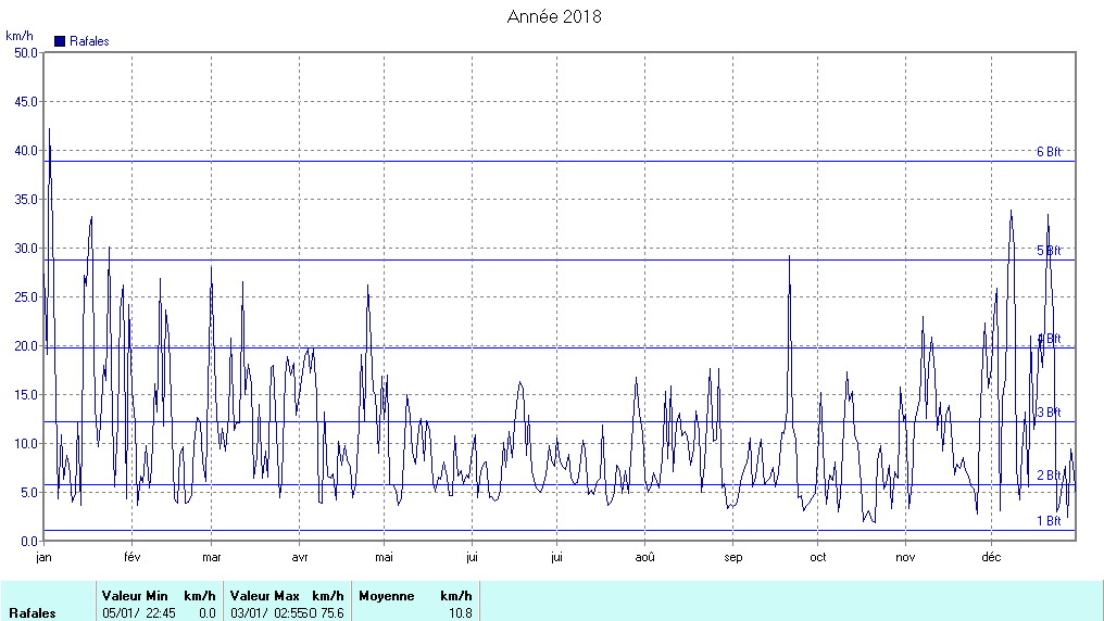 | archives de l'année 2018 Bilan climatique de l'année 2018 Résumé quotidien des relevés automatiques Tous les graphiques en bas de page Bilan climatique de 2018 Nouvelles statistiques sur les premiers et derniers jours de gelées, chaleur, vents dominants et pression moyenne Moyennes pour Saint Riquier calculées sur la période 2001-2017: Moyennes pour Abbeville calculées sur la période 1945-2001 sauf précipitations 1971-2001 Température en °C Précipitations en mm ou L/m2 insolation en heures Voici aussi le tableau des températures par décade relevés mois par mois