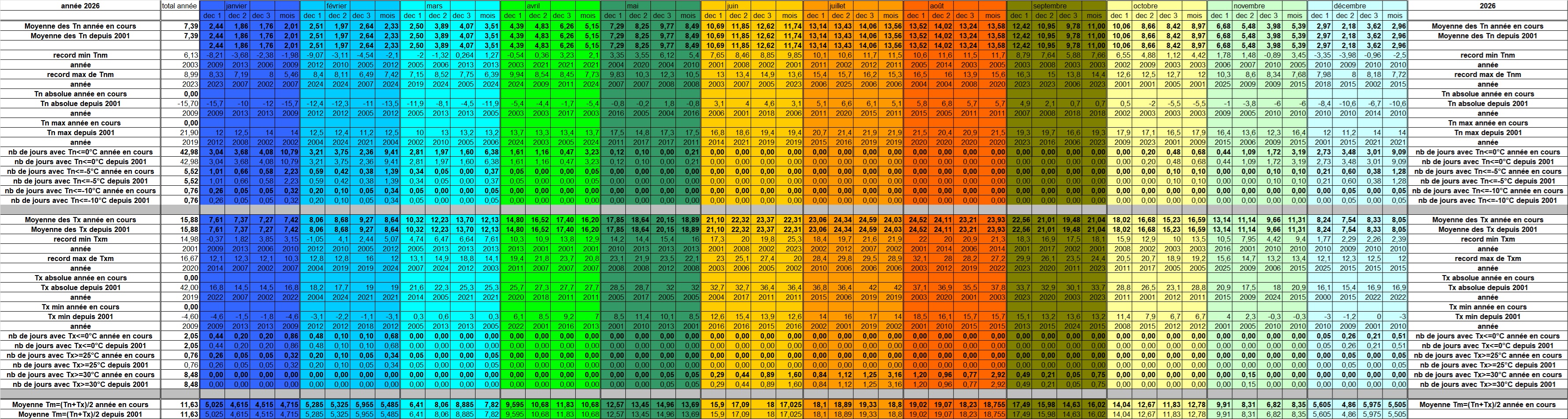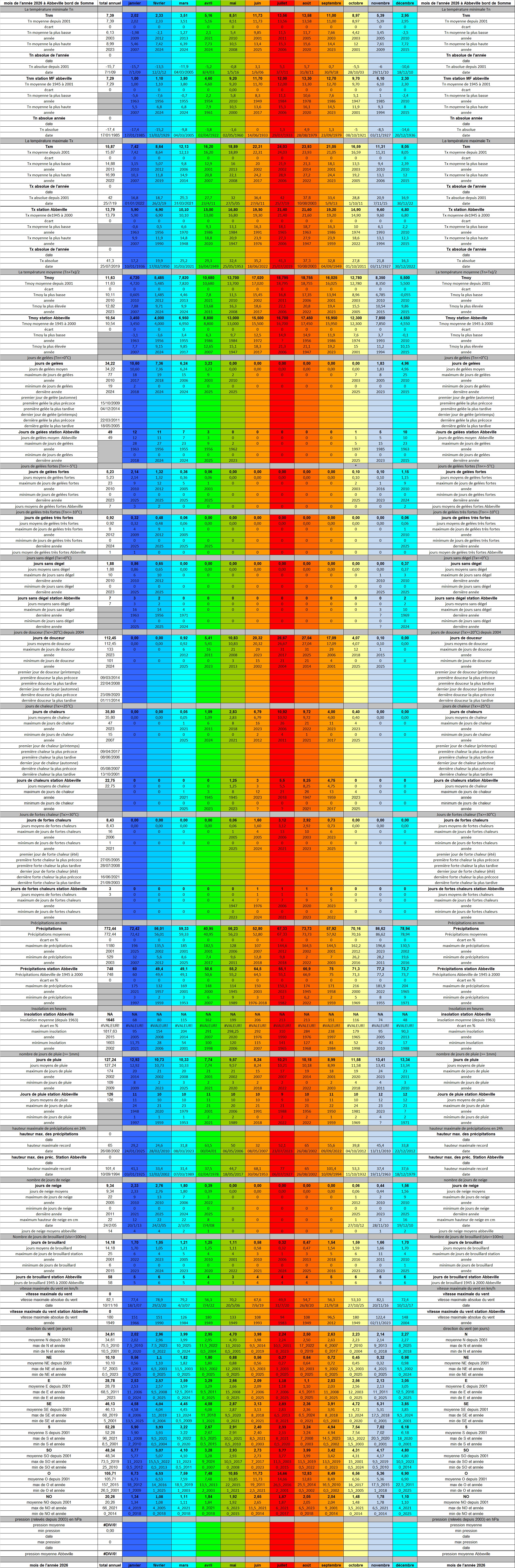 | archives de l'année 2026 Bilan climatique de l'année 2026 Résumé quotidien des relevés automatiques Tous les graphiques en bas de page Bilan climatique de 2026 Nouvelles statistiques sur les premiers et derniers jours de gelées, chaleur, vents dominants et pression moyenne Moyennes pour Saint Riquier puis Abbeville à partir de 2020 calculées sur la période 2001-2024: Moyennes pour Abbeville calculées sur la période 1945-2001 sauf précipitations 1971-2001 Température en °C Précipitations en mm ou L/m2 insolation en heures Voici aussi le tableau des températures par décade relevés mois par mois